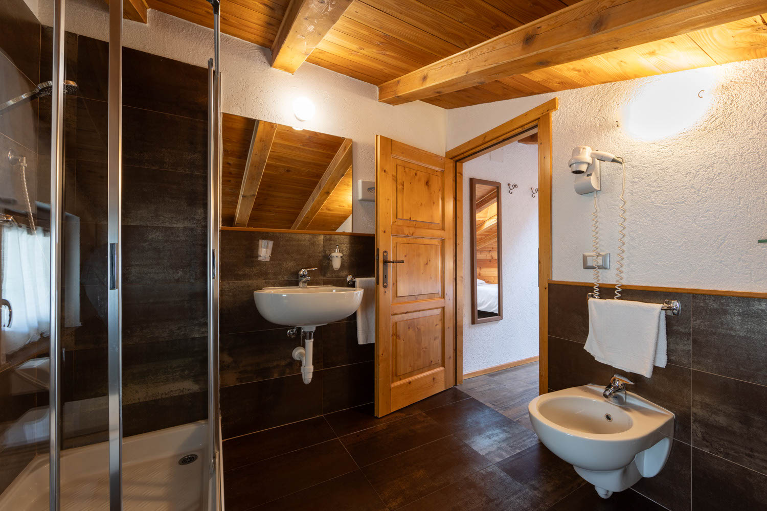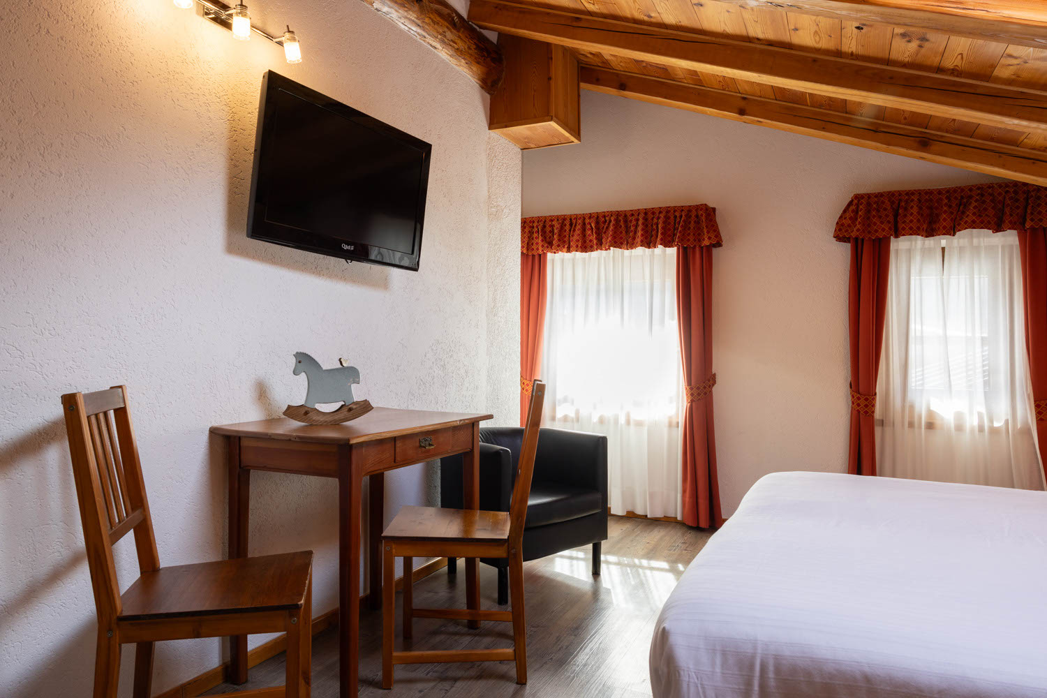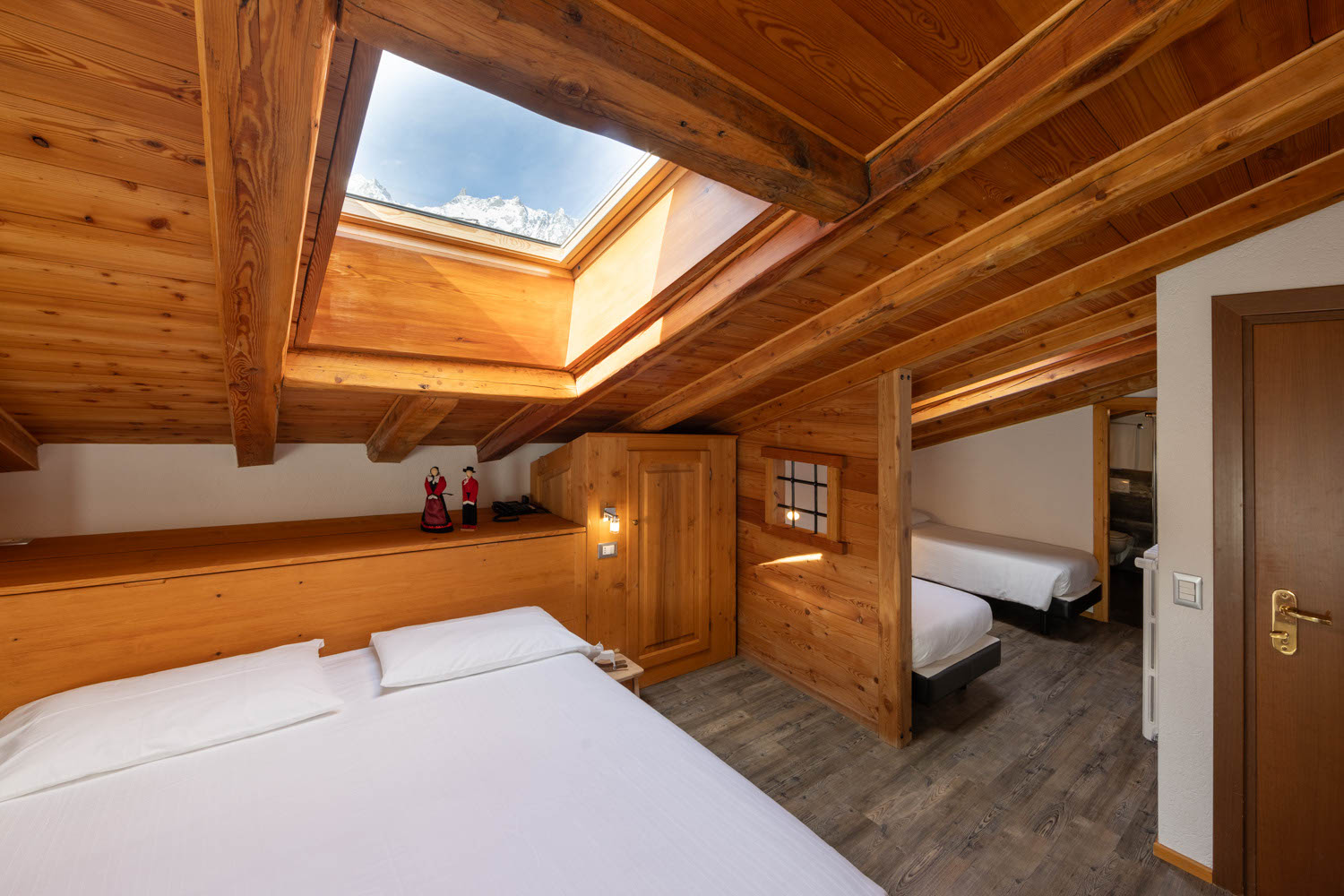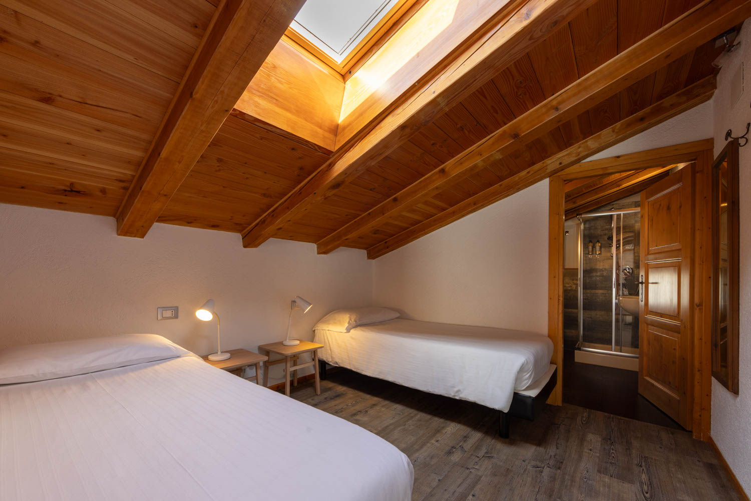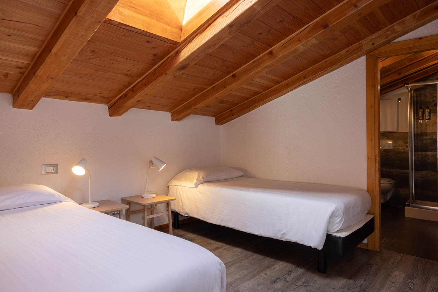 Camera mansardata con tetto in legno a vista, con 1 letto matrimoniale e 2 letti singoli offre riscaldamento autonomo, telefono, TV LCD e WiFi gratuito. Pavimento in parquet. Bagno privato.